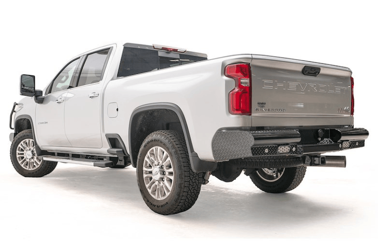 Ranch style rear replacement bumper that integrates the existing receiver hitch. Fab Fours Inc., More than Expected, Better than Expected.